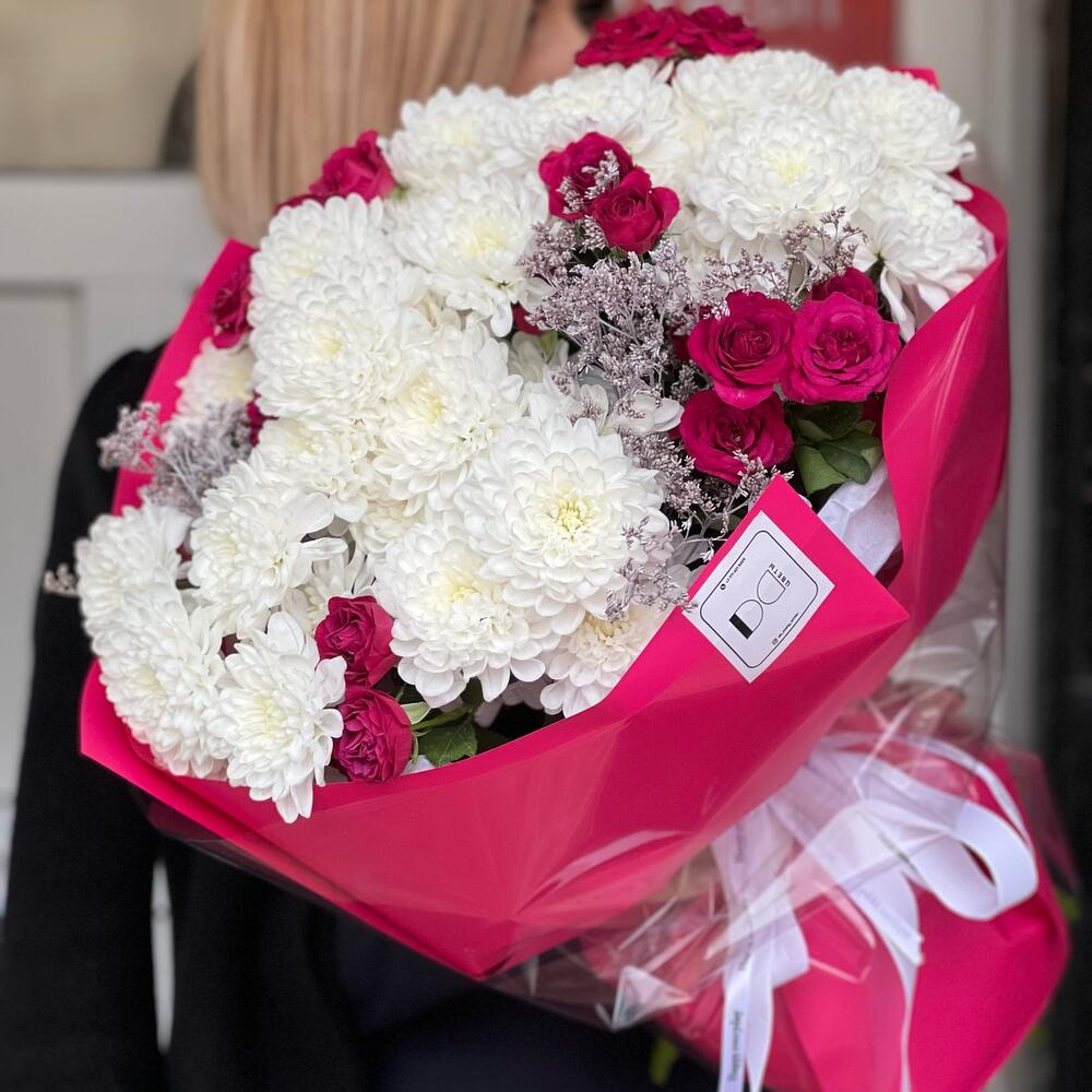 Лимониум - 2 шт. Кустовая роза - 5 шт. Кустовая хризантема - 4 шт. Дизайнерское оформление - 1 шт.