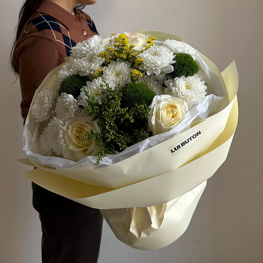 Солидаго - 2 шт. Хризантема - 4 шт. пионовидные розы - 3 шт. диантус мох - 3 шт.