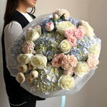 Гортензия - 5 шт. Диантус - 5 шт. розы - 9 шт. кустовые розы - 3 шт.