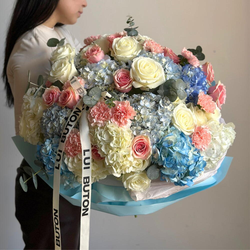 Гортензия - 9 шт. Эвкалипт - 2 шт. Диантус - 7 шт. розы - 21 шт.