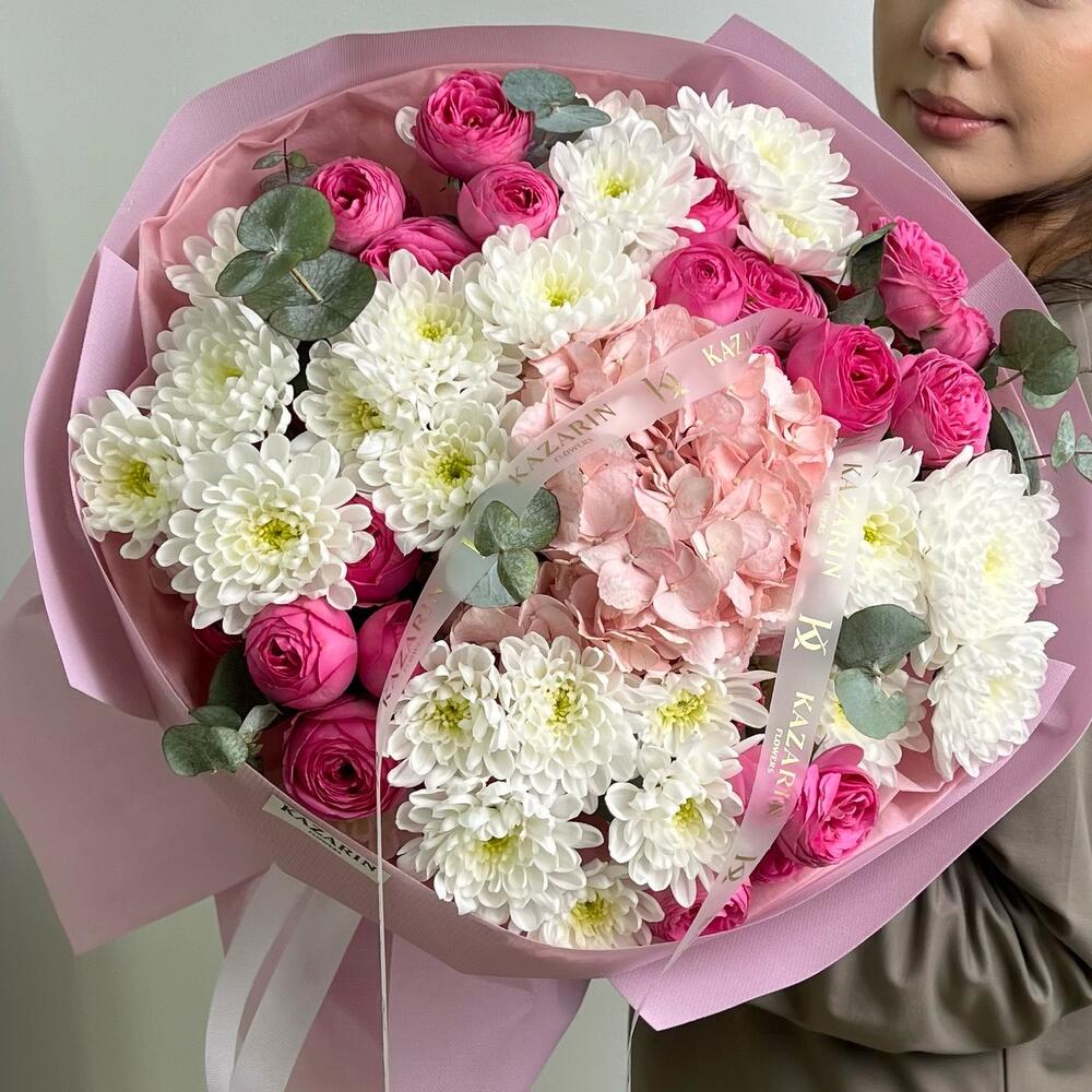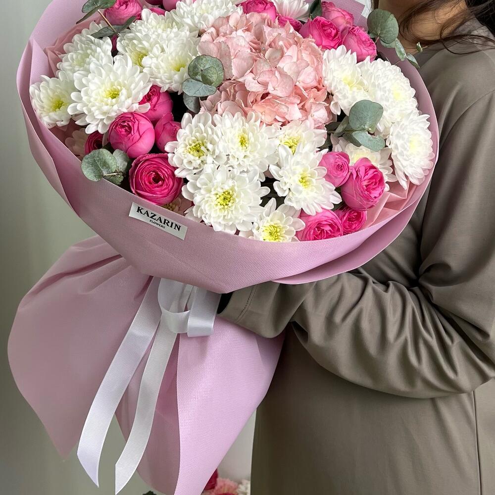 Гортензия - 1 шт. Роза кустовая - 5 шт. Хризантема кустовая - 5 шт. Эвкалипт - 1 шт.
