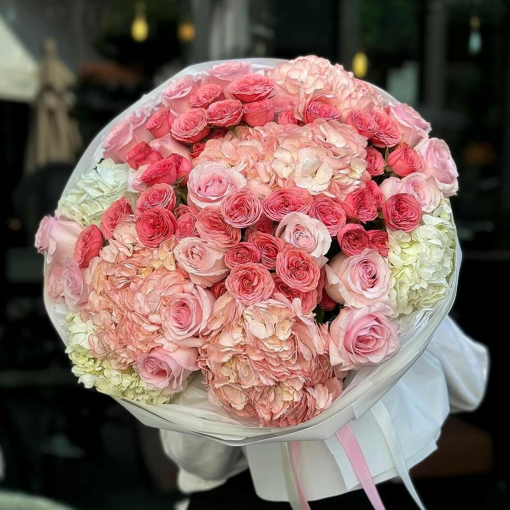 Открытка - 1 шт. Роза голландская 60 см - 17 шт. спрей роза пионовидная (кения) - 9 шт. гортензия (колумбия - 7 шт.