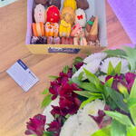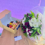 🌸 Цветочная композиция Элегантный букет в нежной упаковке, выполненный в благородной цветовой гамме. Состав: • Белые хризантемы — символ чистоты, искренности и уюта • Бордовые альстромерии — добавляют глубину, изящество и праздничный акцент • Зелень — придаёт объём и свежесть композиции 🍰 Подарочный бокс с мини макаронами и мадленами Стильный бокс с изысканными французскими десертами, аккуратно выложенными внутри. Внутри бокса: • Мини макаронсы — нежное миндальное печенье с хрустящей корочкой и мягкой начинкой, выполненные в разных оттенках и вкусах. • Мадлены — воздушные бисквитные пирожные с мягкой текстурой и сливочным вкусом, покрытые глазурью и декорированные аккуратными деталями. 💌 Открытка Лаконичная карточка для тёплых слов и пожеланий. Отлично дополняет подарок и делает его более личным и душевным.