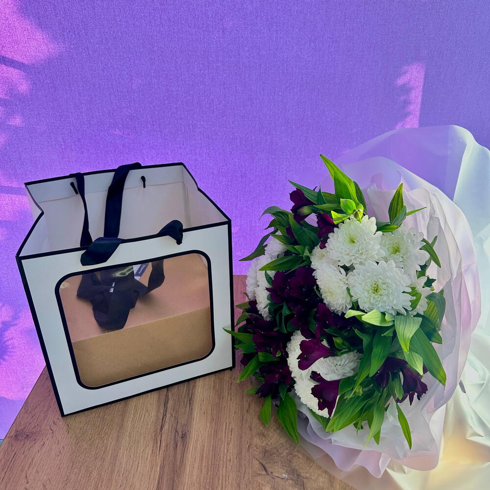 🌸 Цветочная композиция Элегантный букет в нежной упаковке, выполненный в благородной цветовой гамме. Состав: • Белые хризантемы — символ чистоты, искренности и уюта • Бордовые альстромерии — добавляют глубину, изящество и праздничный акцент • Зелень — придаёт объём и свежесть композиции 🍰 Подарочный бокс с мини макаронами и мадленами Стильный бокс с изысканными французскими десертами, аккуратно выложенными внутри. Внутри бокса: • Мини макаронсы — нежное миндальное печенье с хрустящей корочкой и мягкой начинкой, выполненные в разных оттенках и вкусах. • Мадлены — воздушные бисквитные пирожные с мягкой текстурой и сливочным вкусом, покрытые глазурью и декорированные аккуратными деталями. 💌 Открытка Лаконичная карточка для тёплых слов и пожеланий. Отлично дополняет подарок и делает его более личным и душевным.