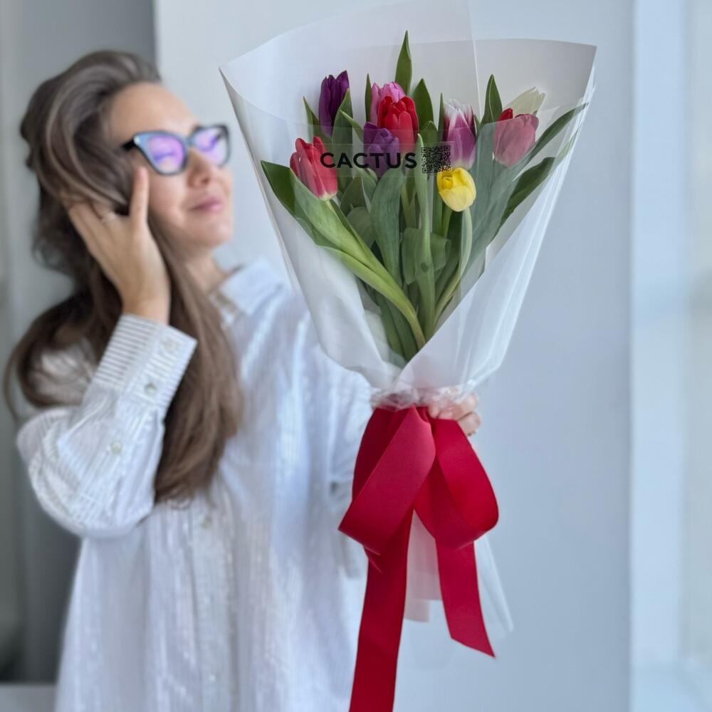 Букет «ХРУСТЯЩИЕ ТЮЛЬПАНЫ» (микс из тюльпанов 9шт фирменной упаковке)