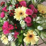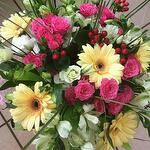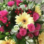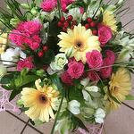 Гиперикум - 4 шт. Берграсс - 3 шт. Роза кустовая розовая - 4 шт. Лизиантус Белый - 3 шт. Гербера Кремовая - 5 шт. альстромериямикс европа - 4 шт.