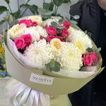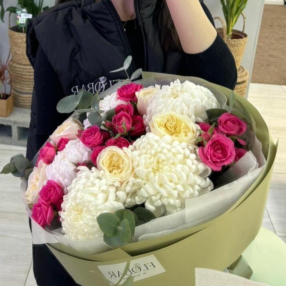 Кустовая роза - 5 шт. Упаковка - 1 шт. Пионовидная роза - 5 шт. Хризантема одноголовая - 5 шт. Эвкалипт Цинерея - 1 шт.