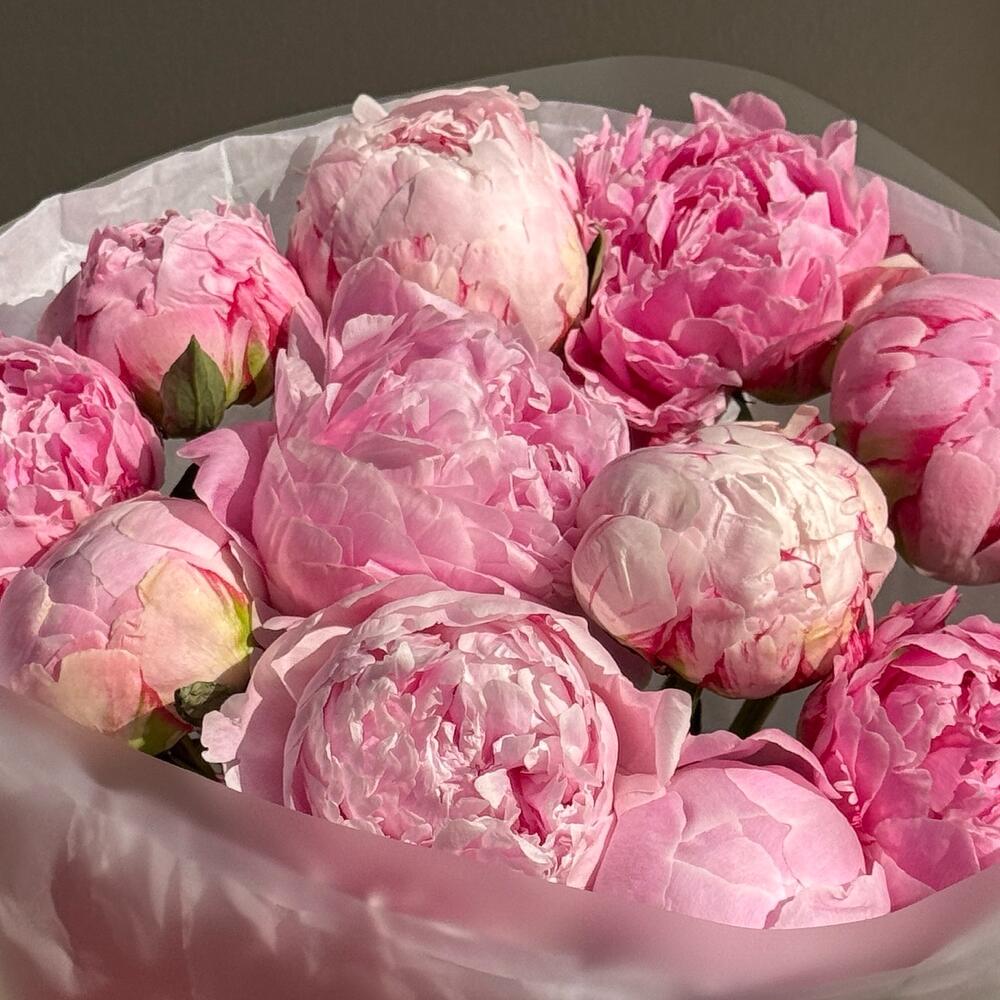 Аквабокс - 1 шт. Авторская упаковка - 1 шт. пионы - 11 шт. витамины для цветов - 1 шт. открытка бесплатная на выбор - 1 шт.