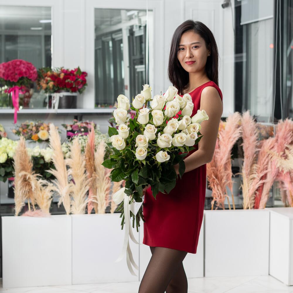 Букет из 25 белых роз, различных цветов высотой 80 см. Выберите идеальный подарок в дополнение к букету, и забудьте об плохих эмоциях