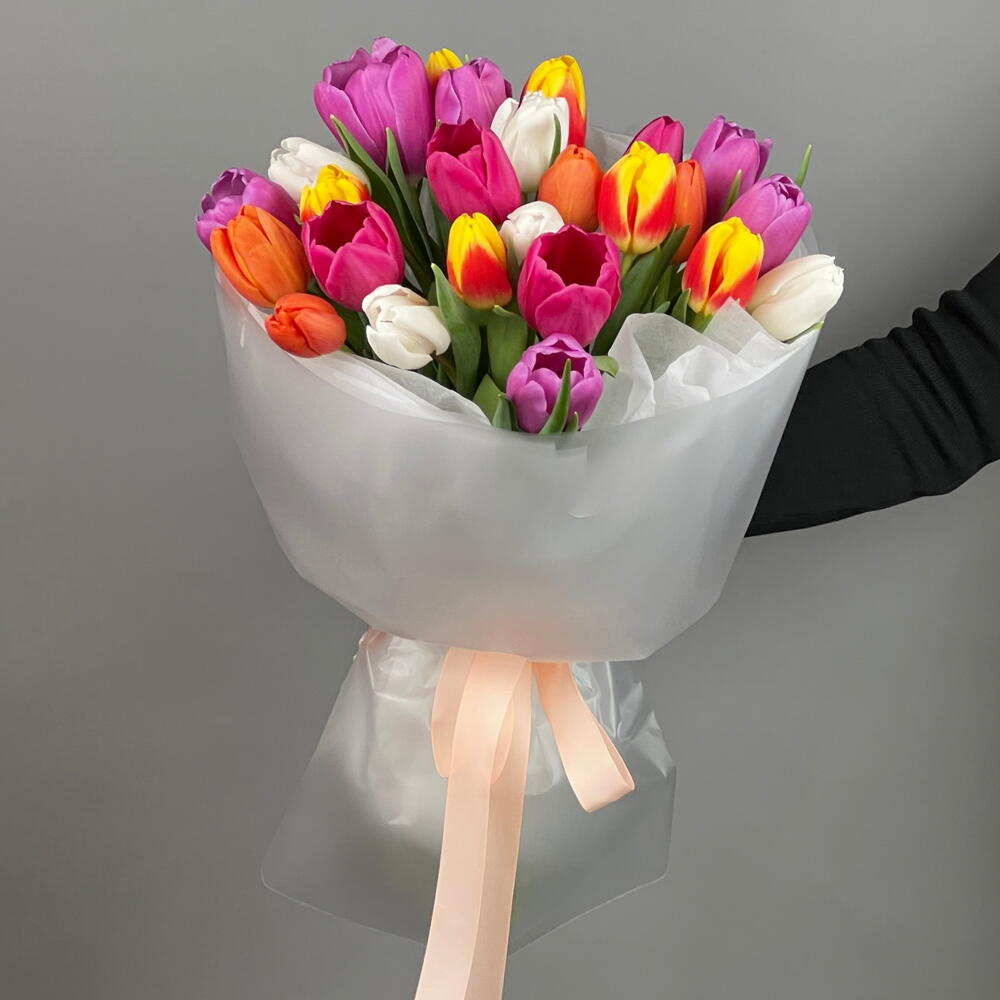 Тюльпаны выглядят одновременно нежно и элегантно, поэтому они всегда остаются одним из самых любимых и универсальных цветов. Букет оформляется в стильную упаковку, которая подчёркивает естественную красоту цветов и делает композицию ещё более эффектной. Свежие тюльпаны долго сохраняют свою красоту и наполняют пространство весенним настроением.