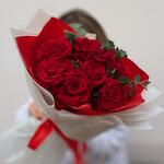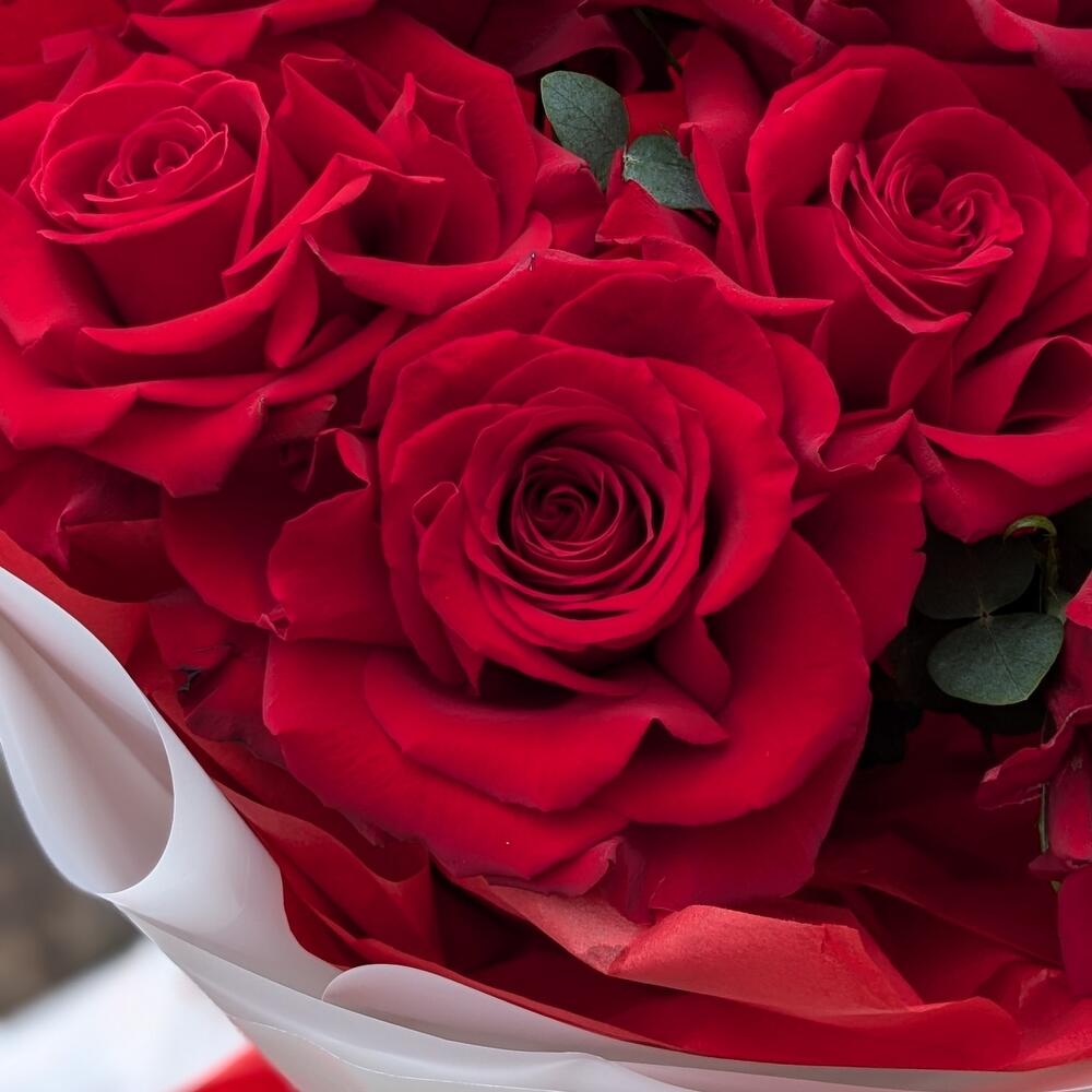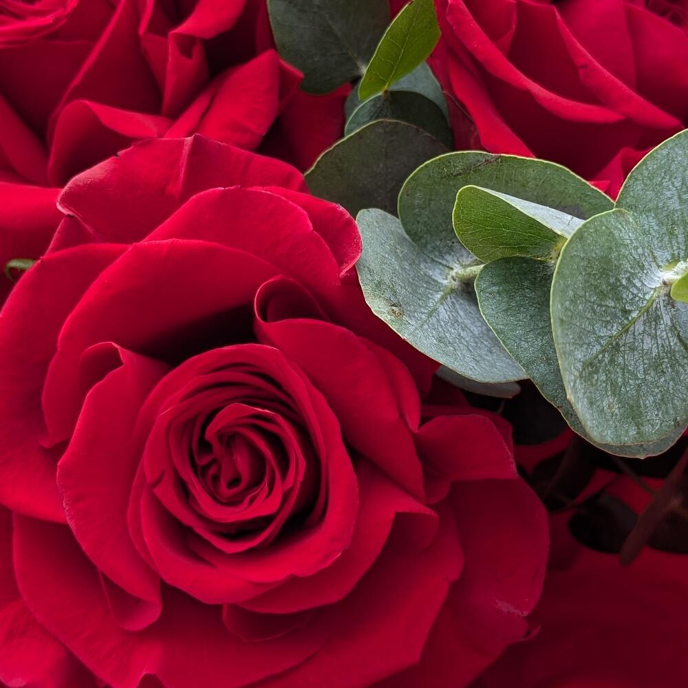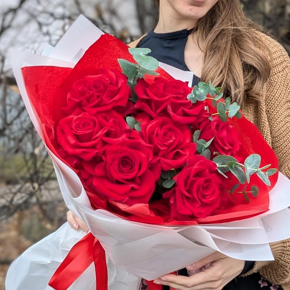Букет из 7 красных французских роз с эвкалиптом