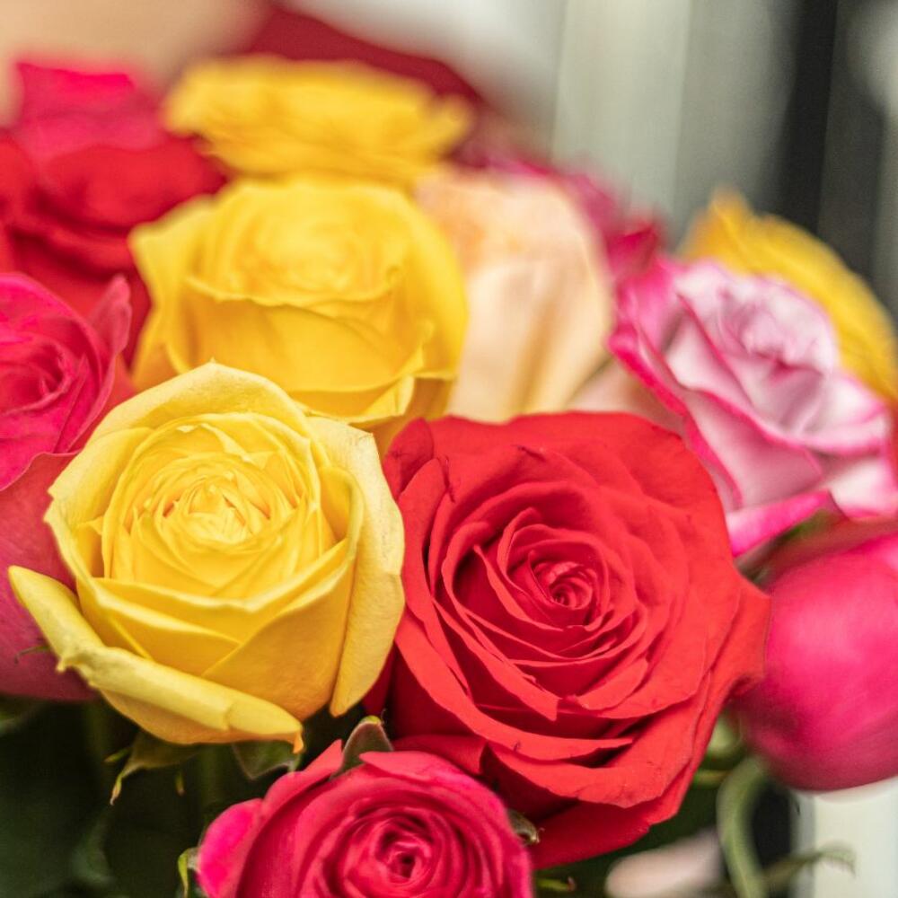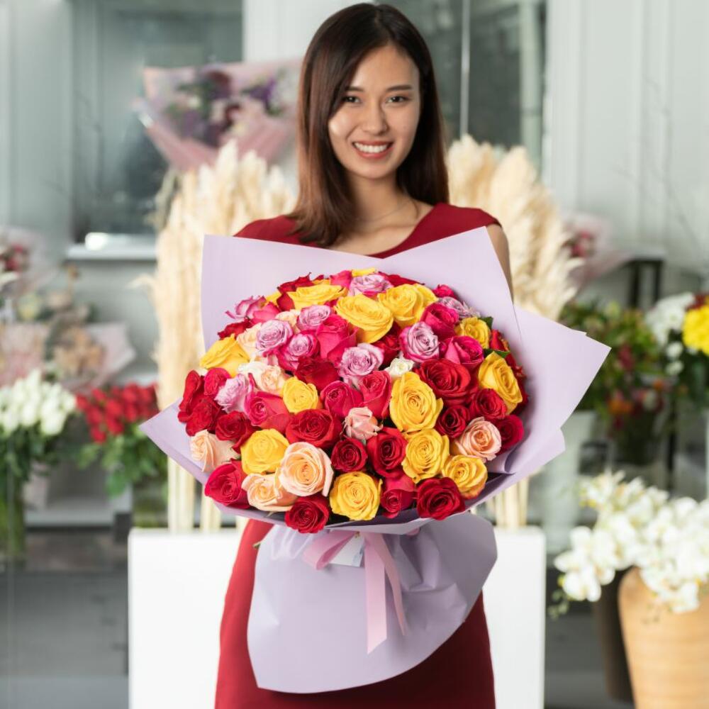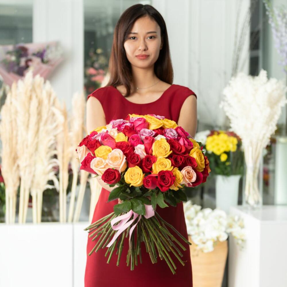 Букет из 75 микс голландских роз 50 см. Яркие расцветки розы поднимут настроение и подарит фейерверк эмоций обладателю букета. Розы — это цветок, который никогда не выйдет их тренда. Букеты в исполнении от Henry Bonnar всегда стильные и заряженные чудесным позитивом. Заказывайте букеты из роз для своих родных, близких и любимых, по любому поводу, когда просто хочется приятно удивить и подарить салют эмоций. Наши флористы могут сделать красивое и стильное оформление букета. *Просьба, при заказе указывать какое оформление вы предпочитаете, под ленту или с аквабумагой. *оттенок роз может отличаться от фото