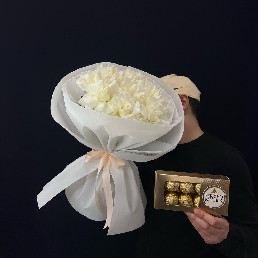 Роза - 7 шт. ферреро роше - 1 шт. Оформление - 1 шт.
