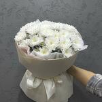 Лёгкий и универсальный букет из белоснежных хризантем. Их пушистые лепестки создают эффект воздушности, а кремовая упаковка и атласная лента придают изысканный, но ненавязчивый вид. Подходит для любого случая – от тёплого знака внимания до выражения искренних чувств.