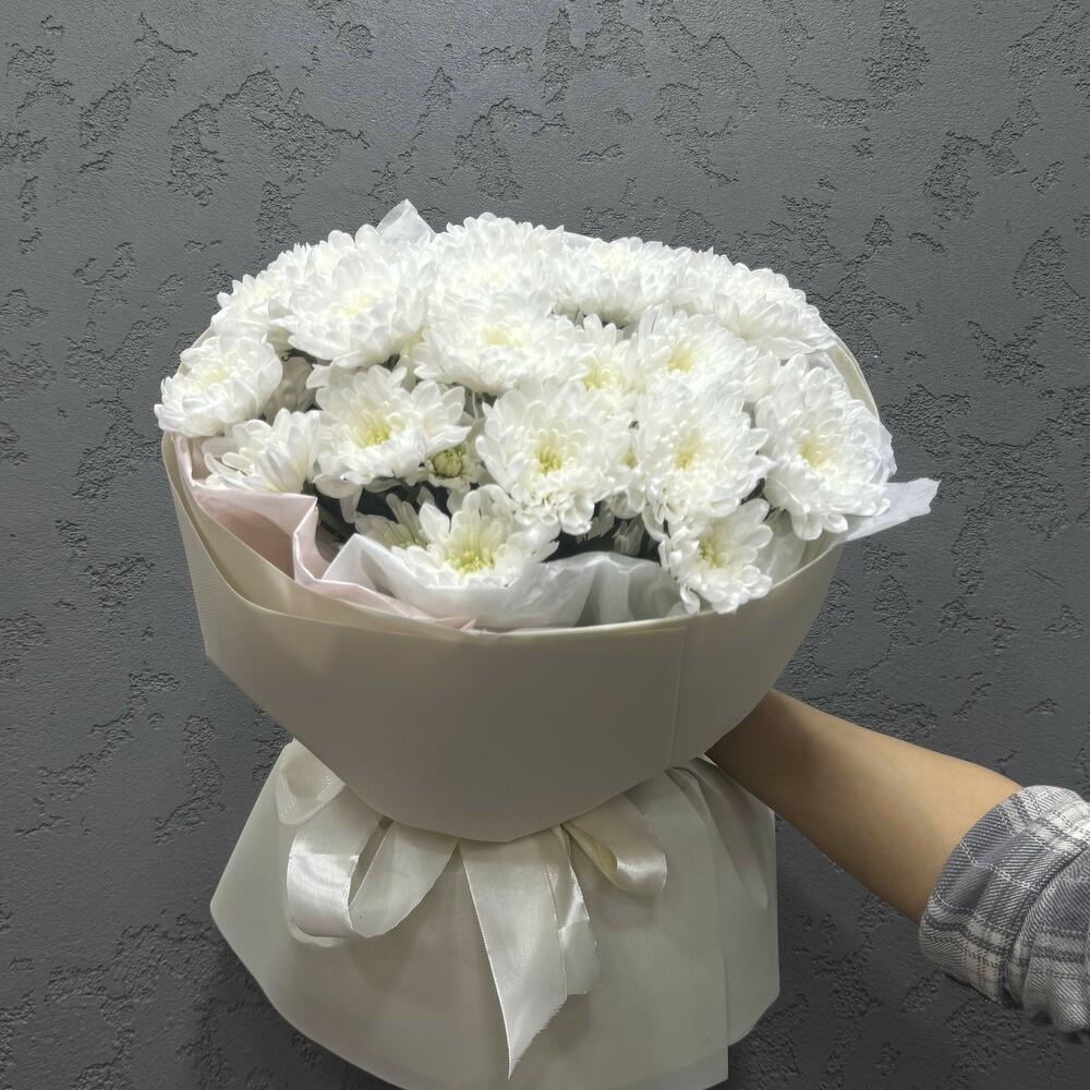 Лёгкий и универсальный букет из белоснежных хризантем. Их пушистые лепестки создают эффект воздушности, а кремовая упаковка и атласная лента придают изысканный, но ненавязчивый вид. Подходит для любого случая – от тёплого знака внимания до выражения искренних чувств.