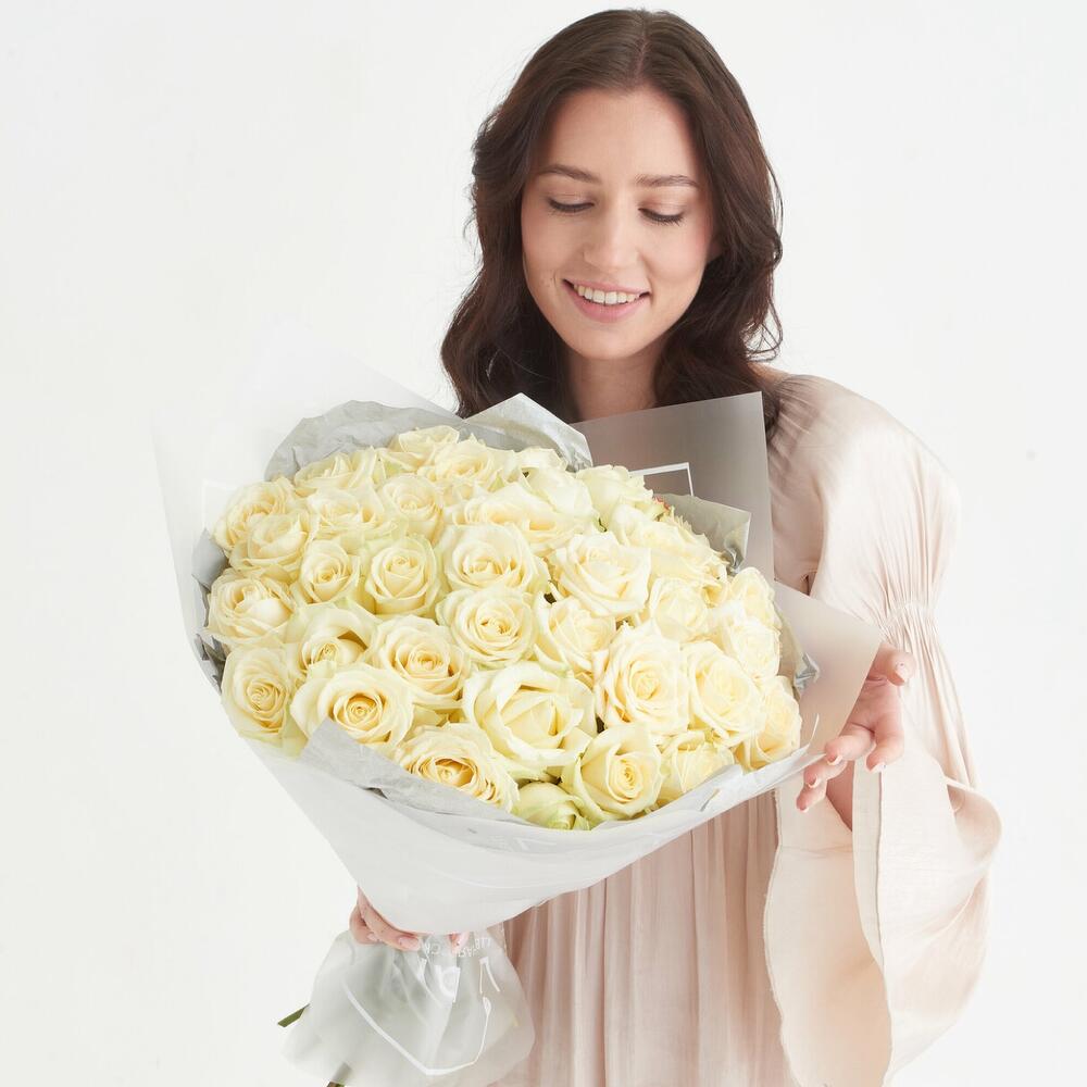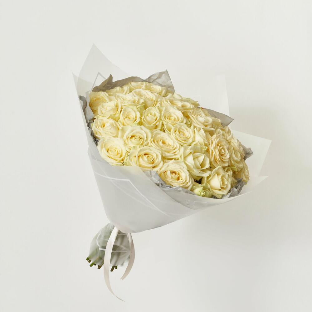 Элегантный букет из кремово-белых роз, оформленный в изящную упаковку. Идеальный выбор для выражения чистоты и нежности чувств✨