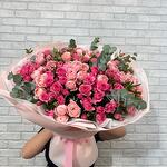 Эвкалипт - 5 шт. Бант - 1 шт. джульетта роза пионовидная - 16 шт. Спрей роза - 15 шт. Фоамиран (упаковка) - 6 шт. Бумага тишью - 6 шт.