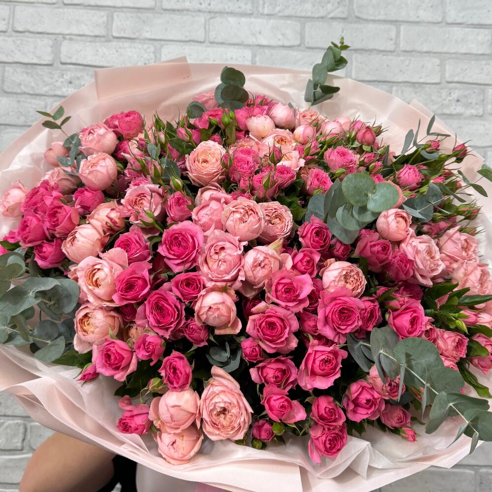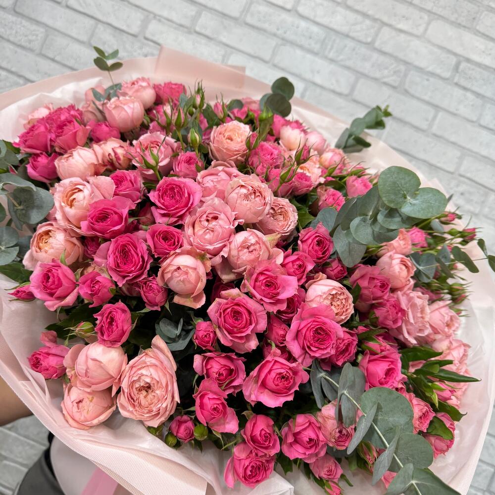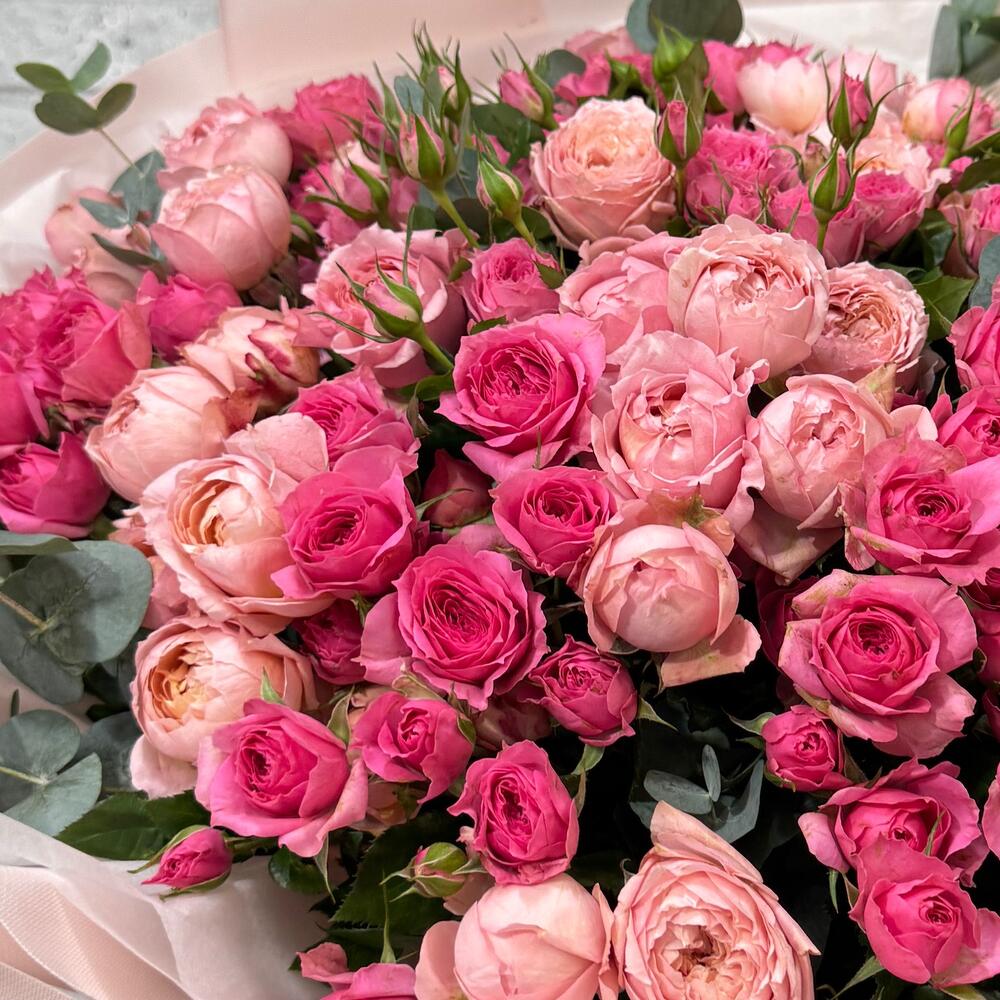 Эвкалипт - 5 шт. Бант - 1 шт. джульетта роза пионовидная - 16 шт. Спрей роза - 15 шт. Фоамиран (упаковка) - 6 шт. Бумага тишью - 6 шт.