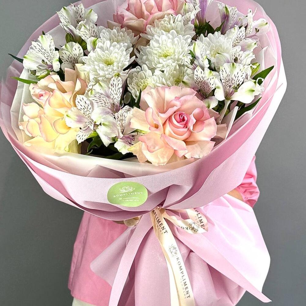 Роза французская розовая - 3 шт. хризантема алтай - 2 шт. альстромерия белая - 4 шт.