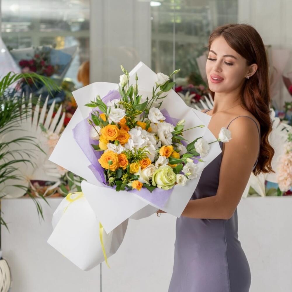 Букет "Желтые лучи" состав: гортензия 1 шт, розы 16 шт, эустома лизиантус 5 шт, кустовые спрей розы 5 шт, с добавлением солидаги 4 шт. Заказывайте нежные и милые букеты от H.Bonnar, радуйте близких и любимых. *Букет может отличаться на 15% от фото