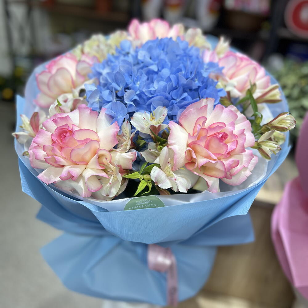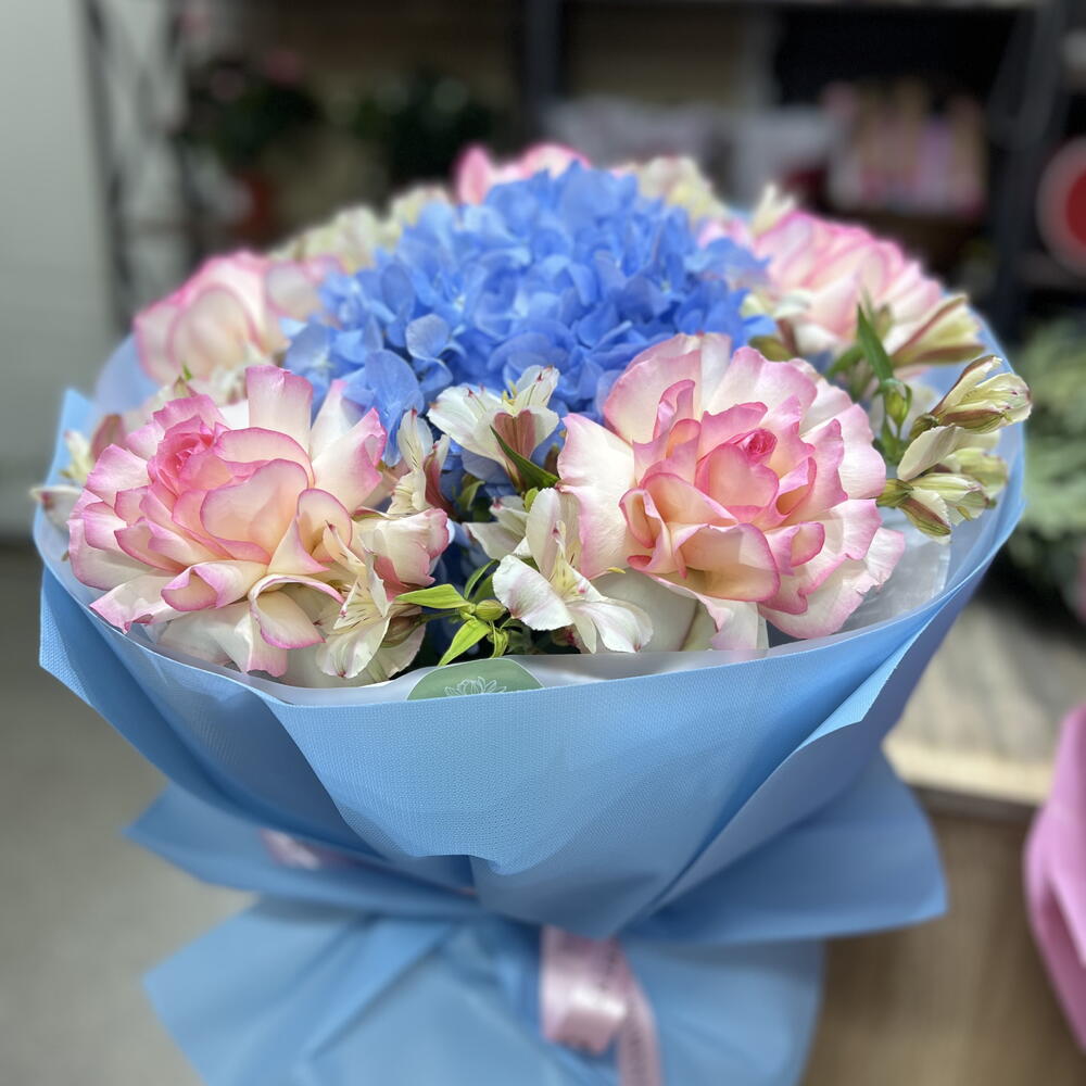 Альстромерия - 5 шт. Гортензия голубая - 1 шт. Роза французская розовая - 5 шт.