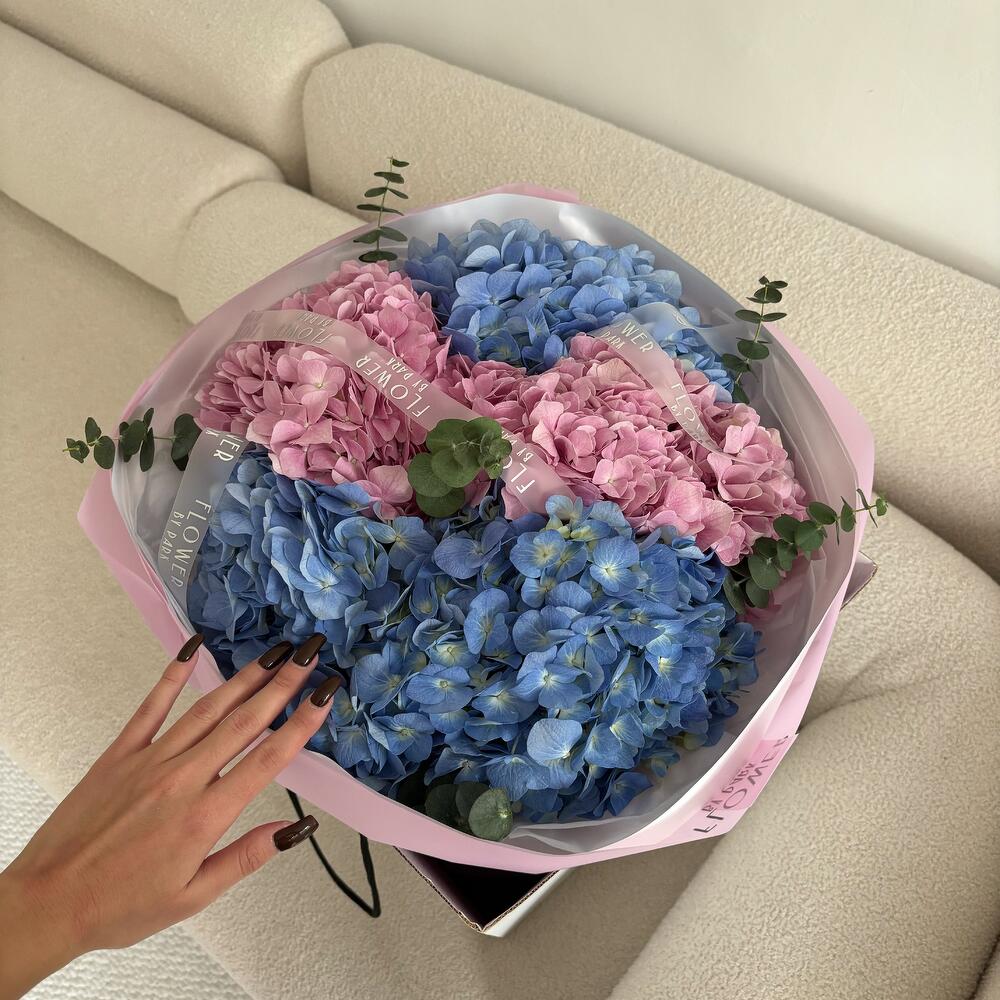Эффектный букет из крупных соцветий гортензии в нежно-розовом и небесно-голубом оттенках. Дополнен эвкалиптом и оформлен в пастельную упаковку. Такой букет поражает своей лёгкостью и изысканностью, дарит ощущение свежести и романтики 💕 Идеальный выбор для поздравления с днём рождения, годовщиной, а также для признаний в любви 😻