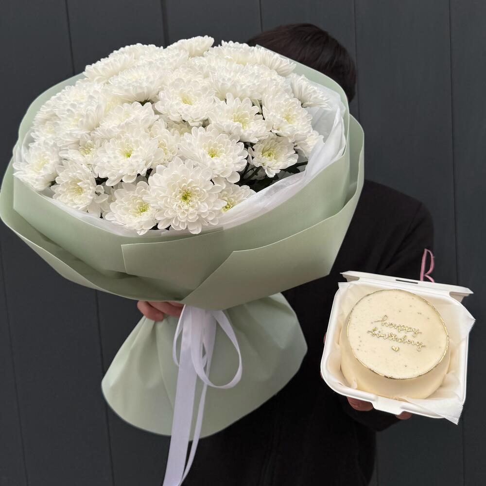 Букет из хризантем и бенто торт