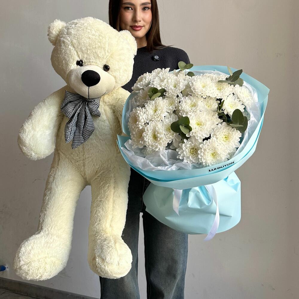 Эвкалипт - 1 шт. хризантемы - 5 шт. мишка 80 см - 1 шт.