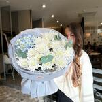 Элегантный букет из кустовой хризантемы и гортензии — это воплощение лёгкости, свежести и гармонии. Нежно-розовая гортензия изысканно сочетается с пушистыми белыми хризантемами и ароматным эвкалиптом, создавая утончённый и воздушный образ. Такой букет идеально подойдёт для подарка на день рождения, благодарности, юбилей или просто чтобы выразить внимание и заботу.