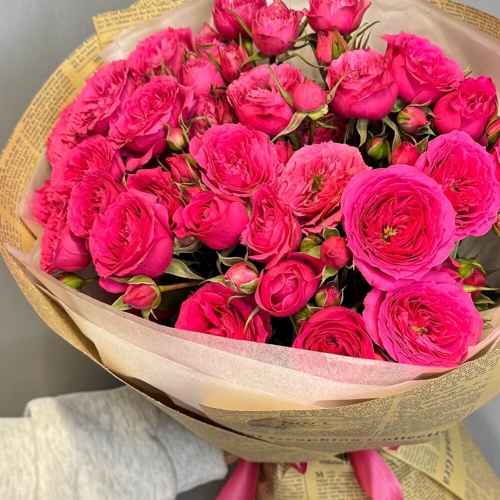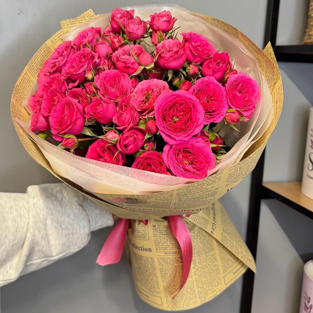 Яркий букет из кустовой спрей розы. Упаковку можно поменять при желании. Открытку и Кризал положим в подарок 🎁