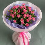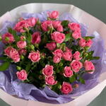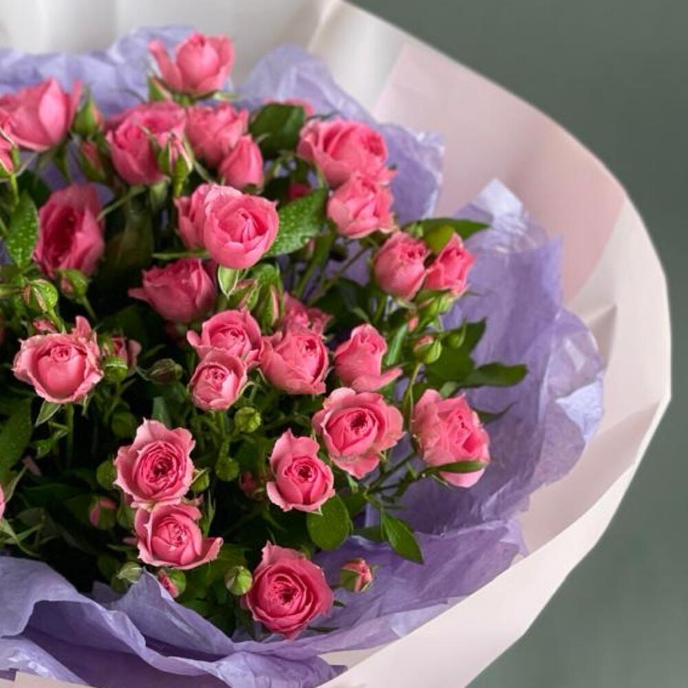 Милый букет из кустовых розовых роз сорта « Софи бейби». Такой букет подойдёт на любой случай и никого не оставит равнодушным. Наш курьер быстро доставить его получателю и бережно вручит прямо в руки.