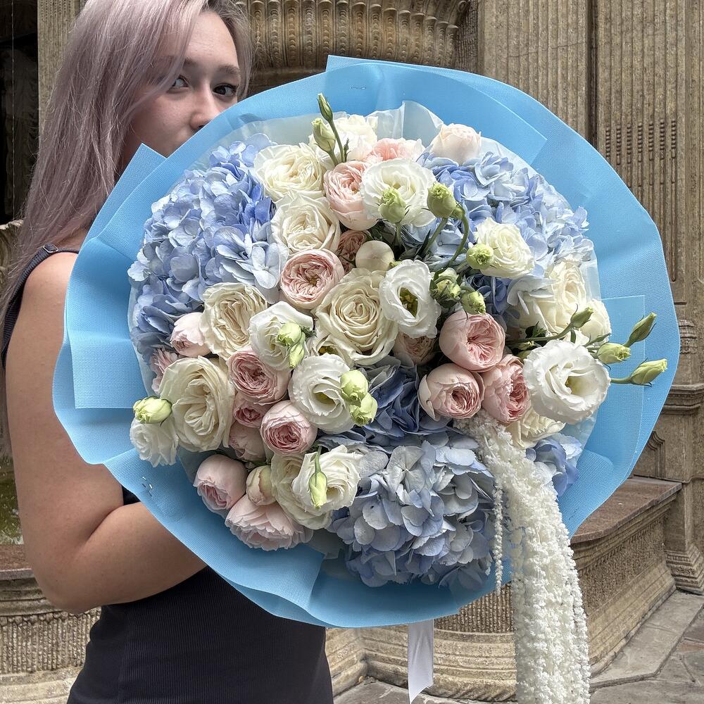 Гортензия - 3 шт. Лизиантус - 5 шт. Роза - 7 шт. Амарант - 1 шт. кустовая спрей роза - 5 шт.