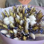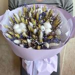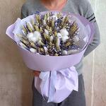 Гипсофила - 4 шт. Лаванда - 50 шт. Лента - 1 шт. Хлопок - 3 шт. Тишью - 2 шт. Пшеница - 25 шт. Лагурус - 17 шт. Пленка матовая - 2 шт.