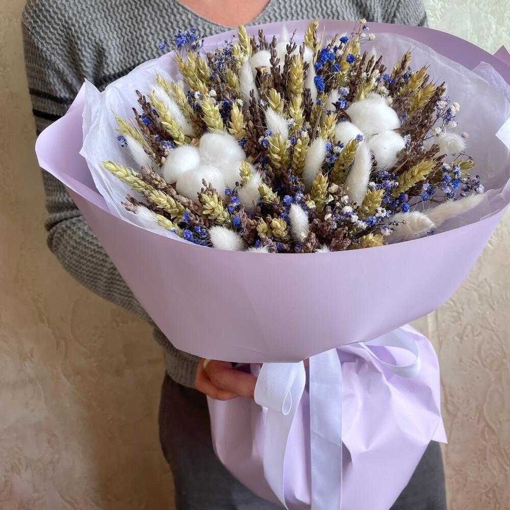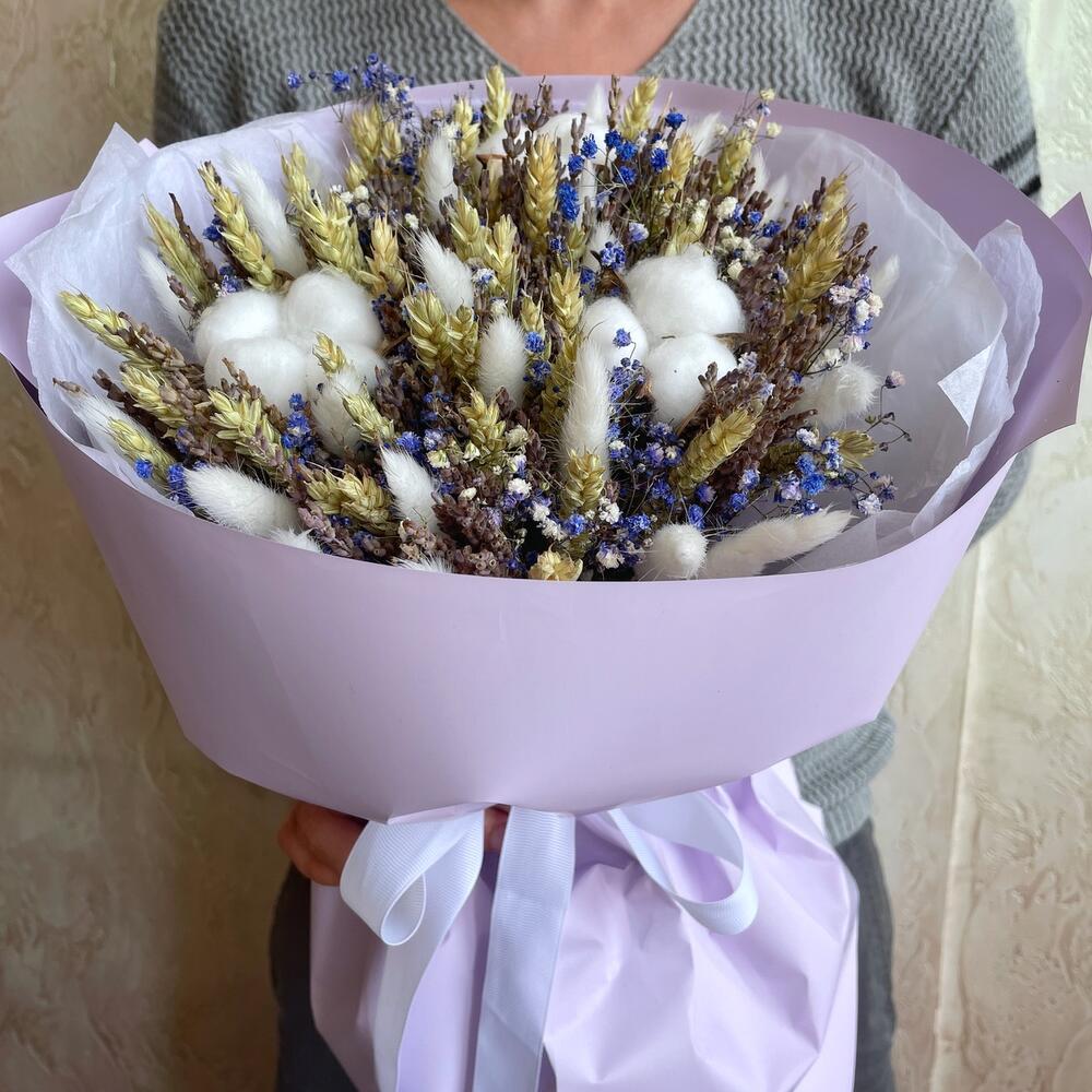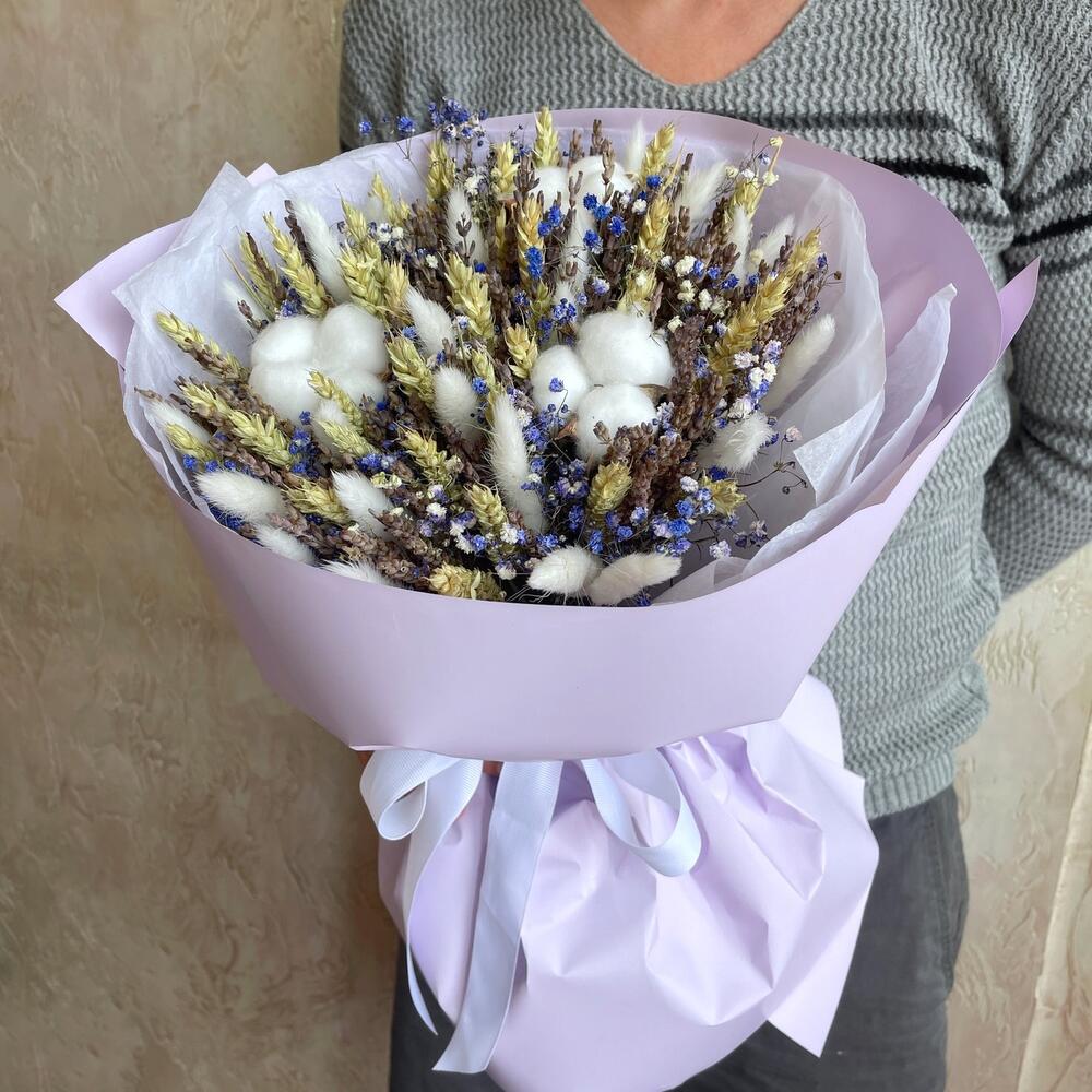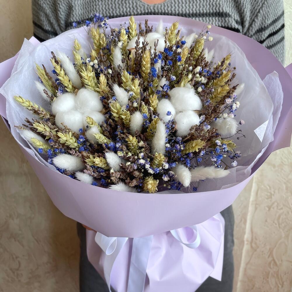 Гипсофила - 4 шт. Лаванда - 50 шт. Лента - 1 шт. Хлопок - 3 шт. Тишью - 2 шт. Пшеница - 25 шт. Лагурус - 17 шт. Пленка матовая - 2 шт.