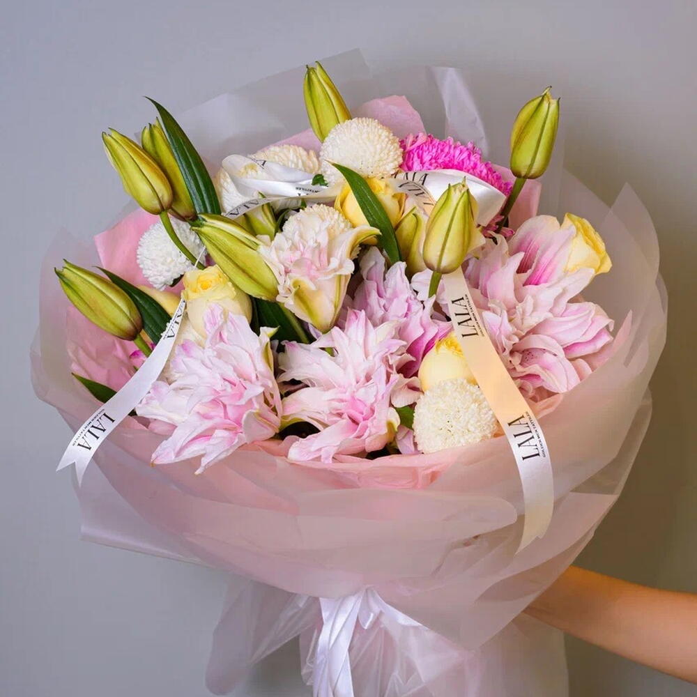 Роза - 7 шт. Хризантема одноголовая - 6 шт. Лилия Розовая - 5 шт.