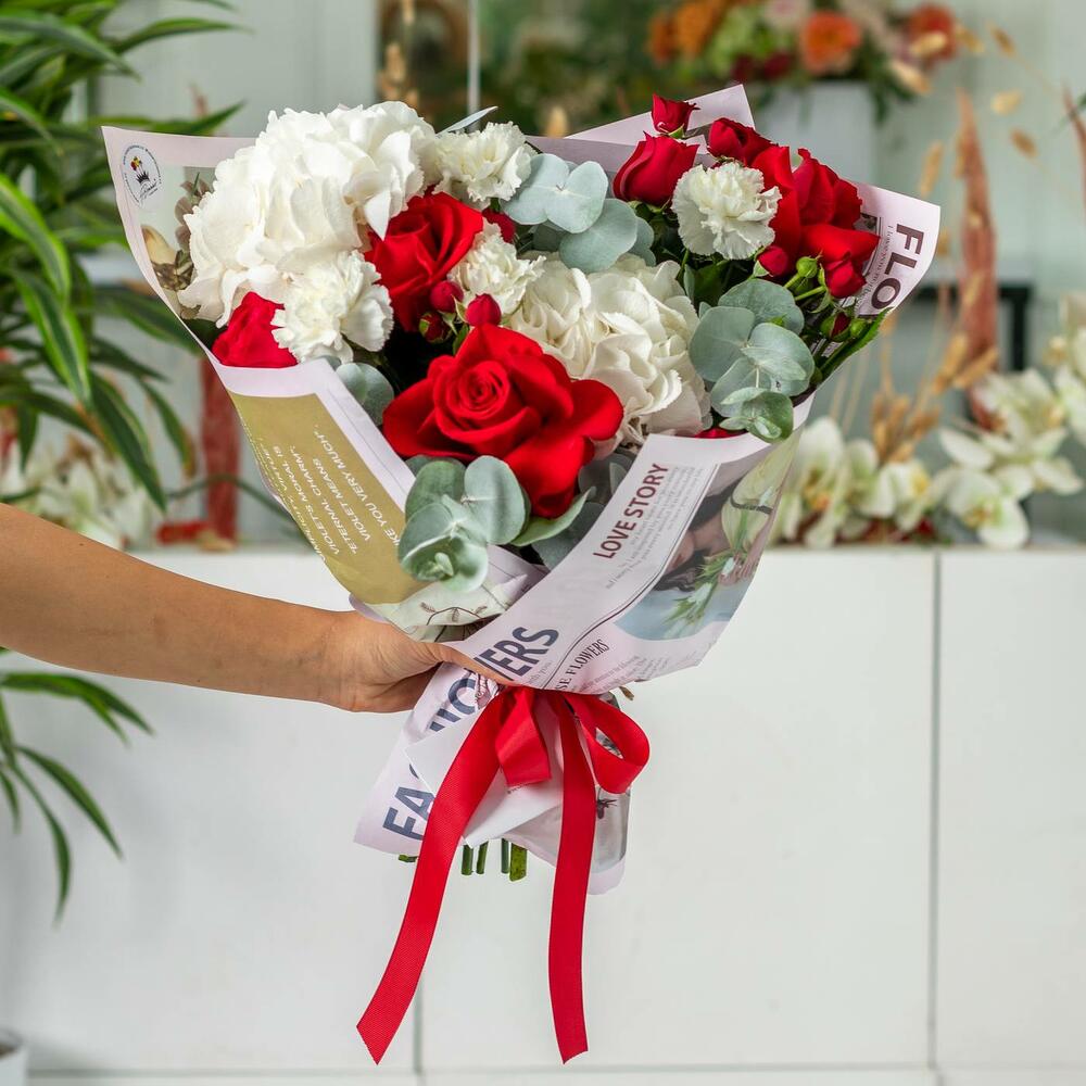 Букет "Алтыным" состав: гортензия 2 шт, розы 4 шт, одноголовые гвоздики 7 шт, кустовая спрей роза 4 шт, украшенный зеленью эвкалипта 5 шт. Прекрасный букет от H.Bonnar, выполненный в оригинальной сборке, для самых элегантных и изящных дам.