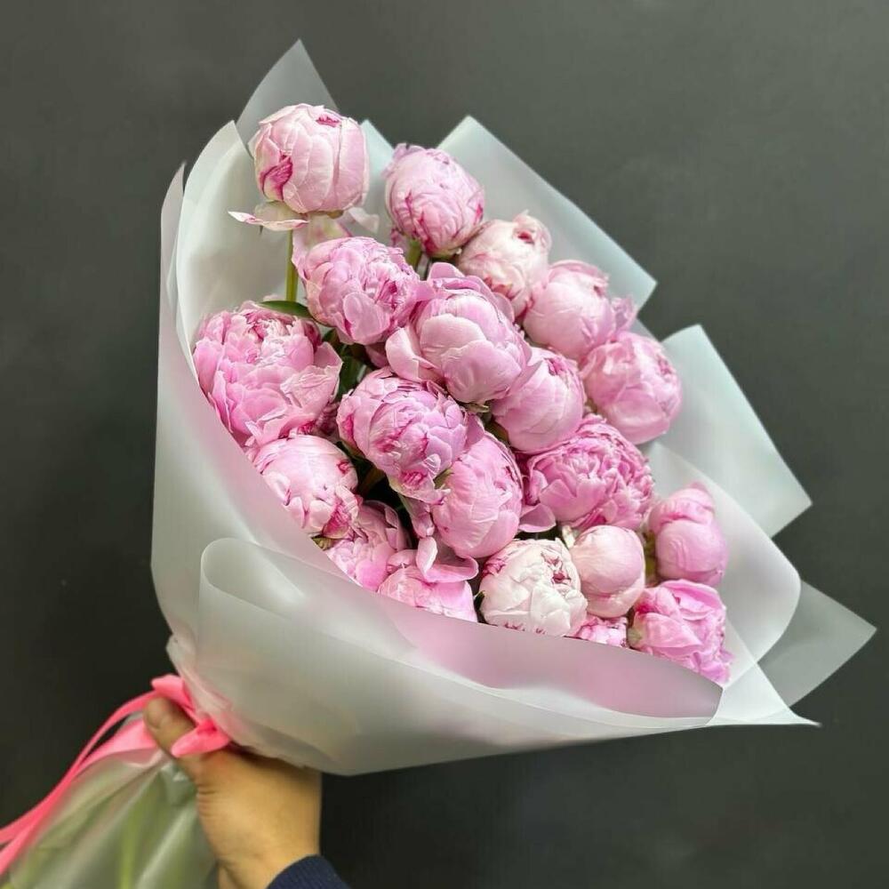 Лента атласная - 2 шт. Дизайнерская упаковка - 4 шт. пионы сара бернар - 19 шт.