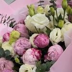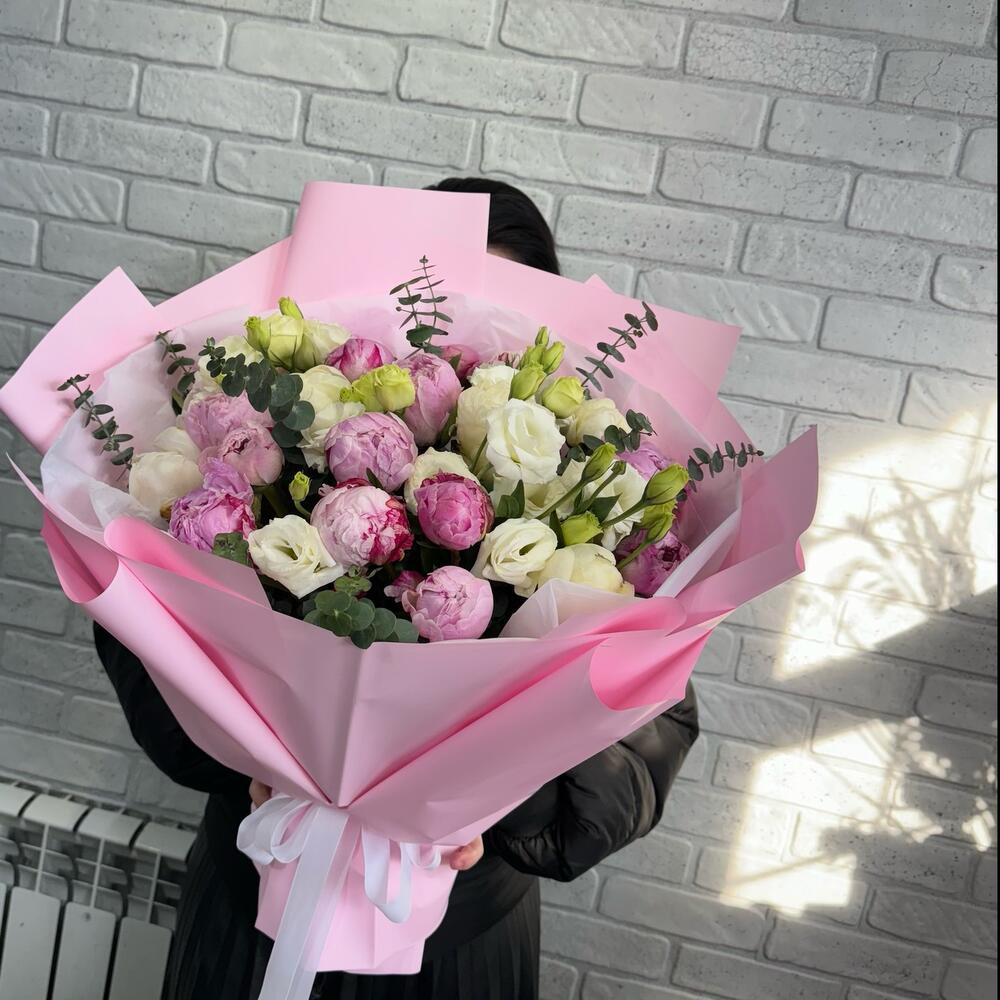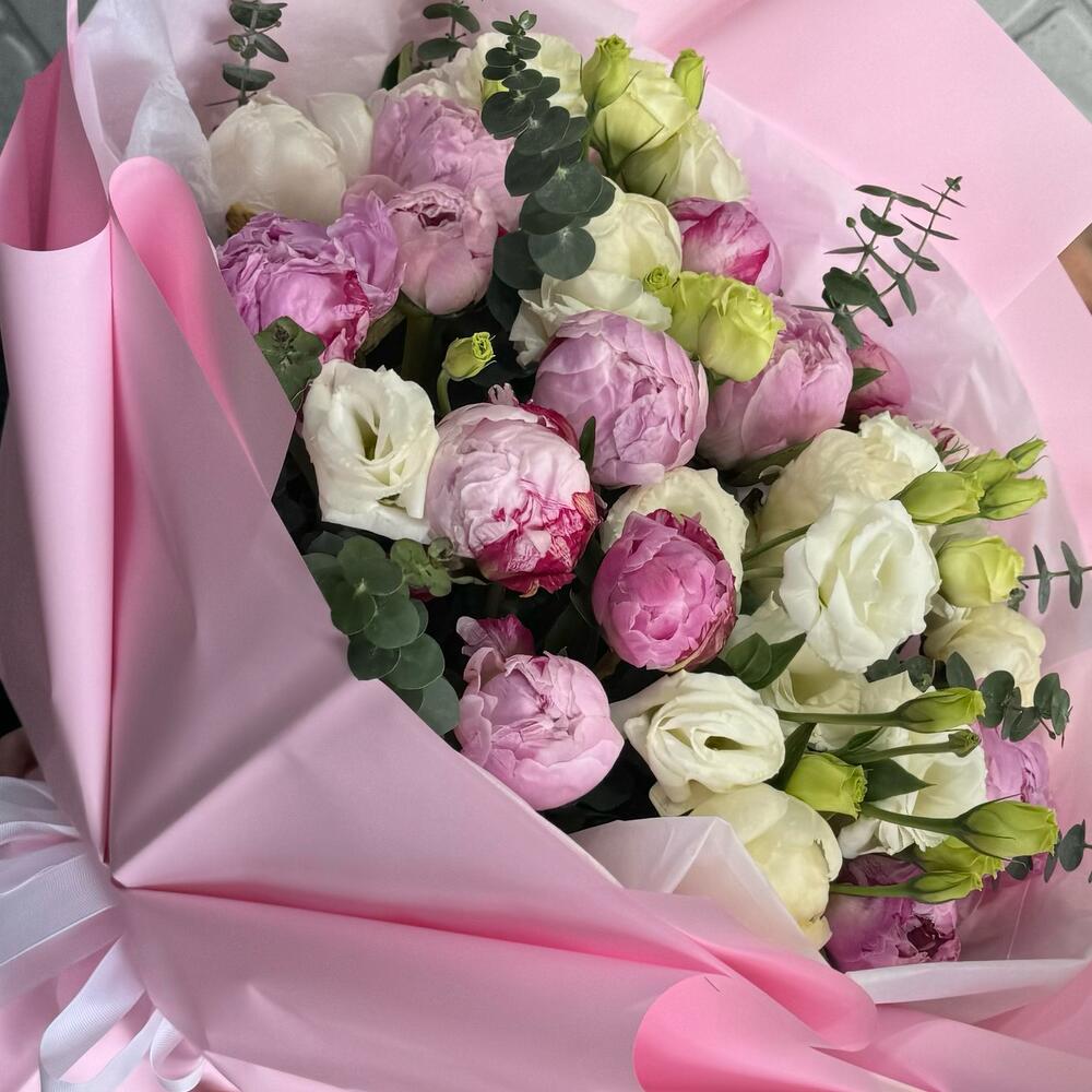 Упаковка - 5 шт. Пион Сара Бернар - 21 шт. эустома белая - 5 шт. Эвкалипт Baby Blue - 7 шт.