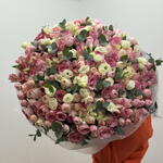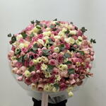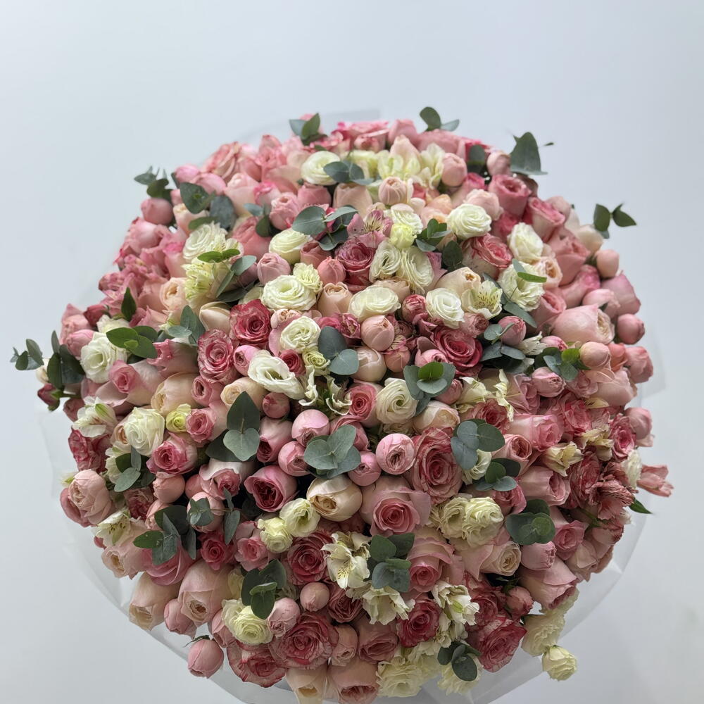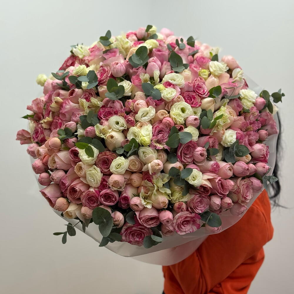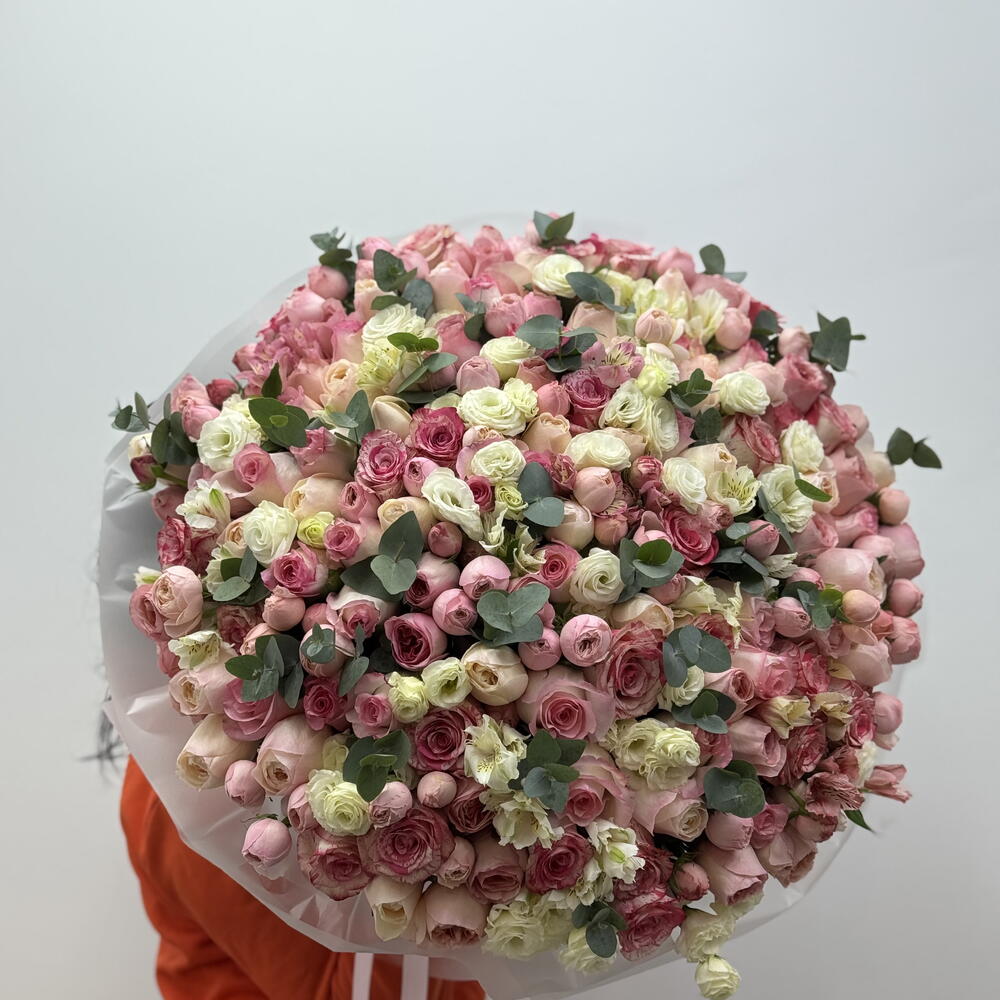 Роза Эквадор 60 см - 40 шт. Эвкалипт Цинерея - 15 шт. эустома белая - 35 шт. пионовидный розы - 20 шт. аострамерия - 10 шт. пионовидный спрей - 35 шт.