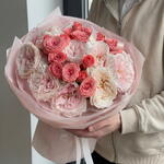 Букет из пионовидных роз Объёмный букет в розово-пудровой гамме, собранный из пионовидных роз и кустовой розой. Композиция оформлена в нежную полупрозрачную упаковку и дополнена брендированной лентой. Подходит для дня рождения, романтического повода или подарка без причины.