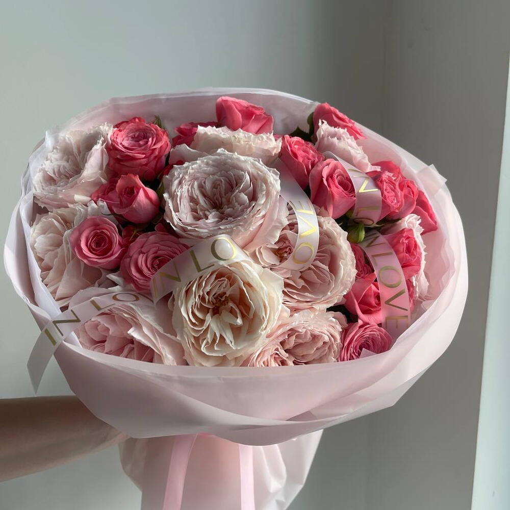 Букет из пионовидных роз Объёмный букет в розово-пудровой гамме, собранный из пионовидных роз и кустовой розой. Композиция оформлена в нежную полупрозрачную упаковку и дополнена брендированной лентой. Подходит для дня рождения, романтического повода или подарка без причины.