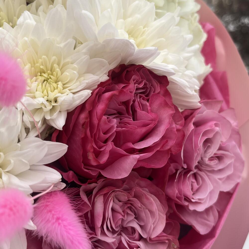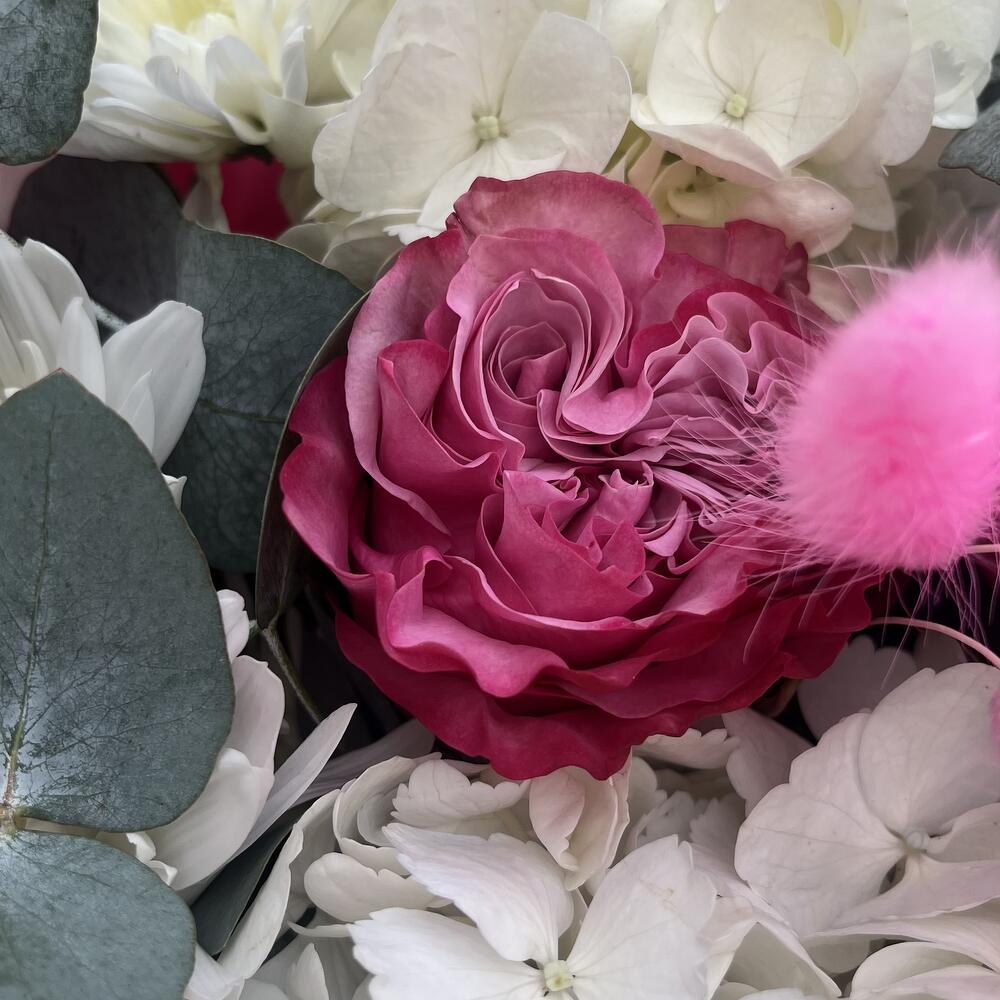 Гортензия - 3 шт. Хризантема кустовая - 4 шт. Эвкалипт - 3 шт. Роза пионовидная - 7 шт. Лагурус - 9 шт.
