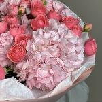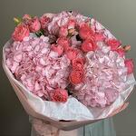 Лента атласная - 1 шт. Роза пионовидная кустовая - 5 шт. Стильная упаковка - 1 шт. гортензия (гидрангея) - 3 шт.