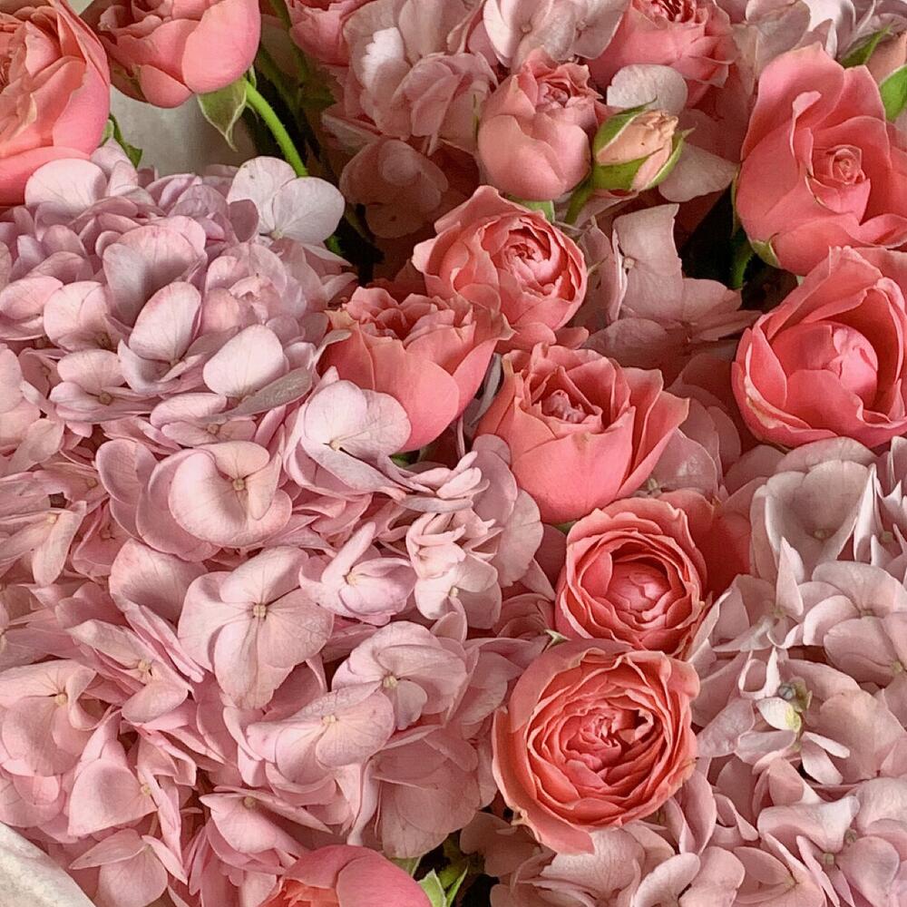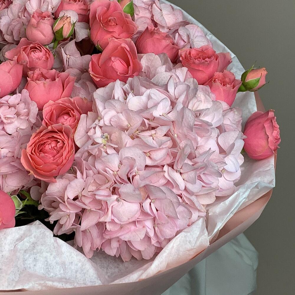 Лента атласная - 1 шт. Роза пионовидная кустовая - 5 шт. Стильная упаковка - 1 шт. гортензия (гидрангея) - 3 шт.