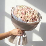 Этот утончённый букет из пионовидных кустовых роз создан для тех, кто ценит элегантность, мягкие оттенки и изысканные детали. Пышные пионовидные бутоны в пастельных кремово-розовых тонах образуют воздушную и гармоничную композицию, наполненную романтикой и утончённостью. Букет станет идеальным подарком для дня рождения, юбилея, свадьбы, годовщины, 8 Марта, дня матери, выписки из роддома или романтического свидания. Нежные пионовидные розы передают самые тёплые эмоции: любовь, благодарность, восхищение и трепетное внимание. Этот букет не просто украшение — это символ искренних чувств.