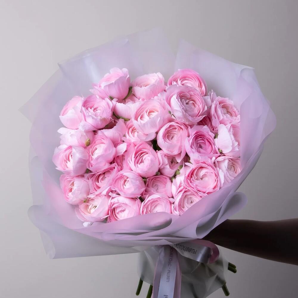 Лента атласная - 1 шт. Ранункулюс - 31 шт. Упаковка дизайнерская - 3 шт. Кризал (подкормка) - 1 шт.