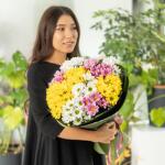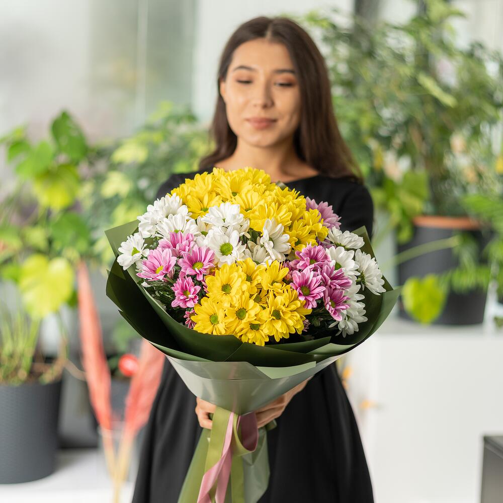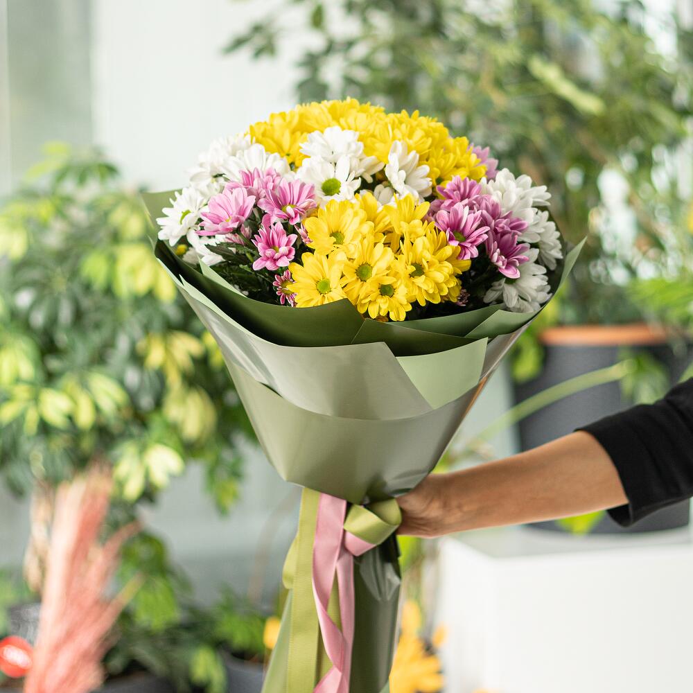 Букет из разноцветных хризантем "Радость" XS состоит из Хризантема 9. Букет из разноцветных хризантем "Радость". Яркий и позитивный букет, приносящий улыбки и фейерверк эмоций. Хризантема — это цветок радости и символ солнца. Дарите приятные воспоминания вместе с букетами Henry Bonnar, также вместе с букетом.