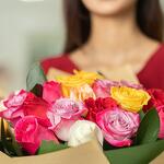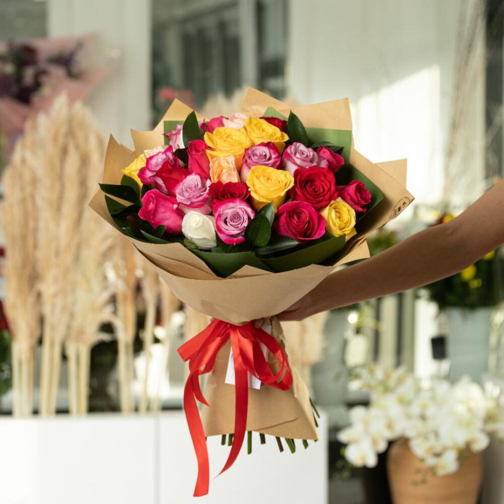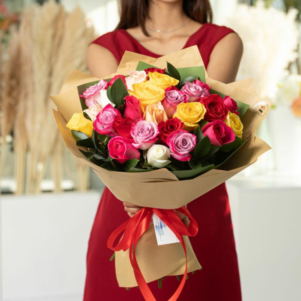Букет из 25 разноцветных роз 50 см с зеленью рускуса 5 шт. Красочный и изящный букет из роз подойдет для любого повода. Доверьте цветам рассказать о Ваших чувствах.