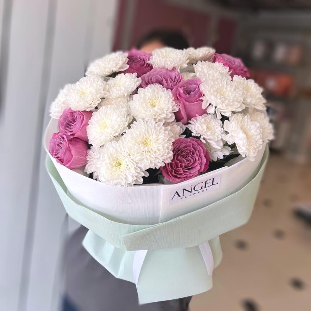 Этот авторский букет - истинное произведение искусства, перенесённое из мира природной красоты. Утончённые розовые розы, в количестве девяти штук, создают атмосферу романтики и любви. Четыре пышные кустовые хризантемы дополняют общую композицию, добавляя пикантности и великолепия. Букет идеально подходит для подарка близким, друзьям или любимым людям, подчеркивая ваше обаяние и чуткость. Чтобы цветы радовали дольше, держите их в прохладной воде, ежедневно обновляйте срезы стеблей и убирайте увядшие листья. Такой уход сохранит свежесть букета до 7–10 дней, позволяя дольше наслаждаться его изысканной красотой.
