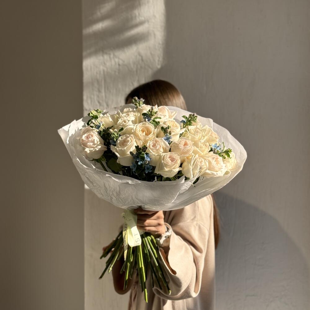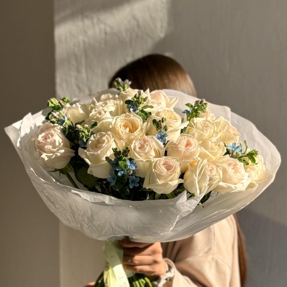 Роза Охара - 23 шт. Фирменная упаковка - 1 шт. Твидия - 9 шт. аквабокс с водой - 1 шт. витамины для цветов (кризал) - 1 шт.